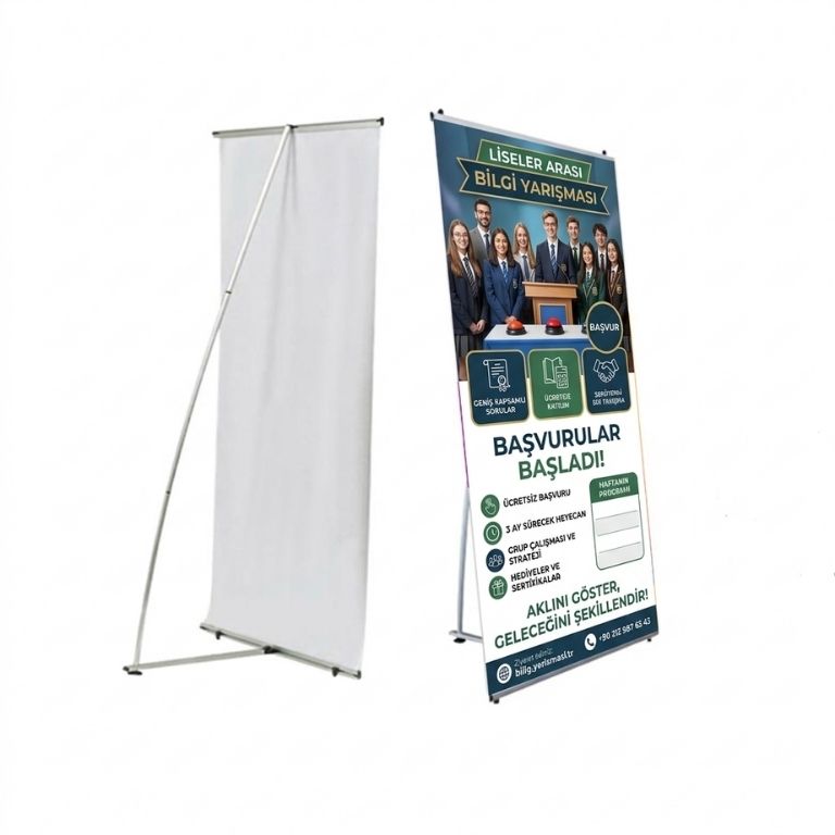 L banner, etkinliklerde, fuarlarda, mağazalarda ve diğer tanıtım alanlarında kullanılan taşınabilir bir reklam aracıdır.